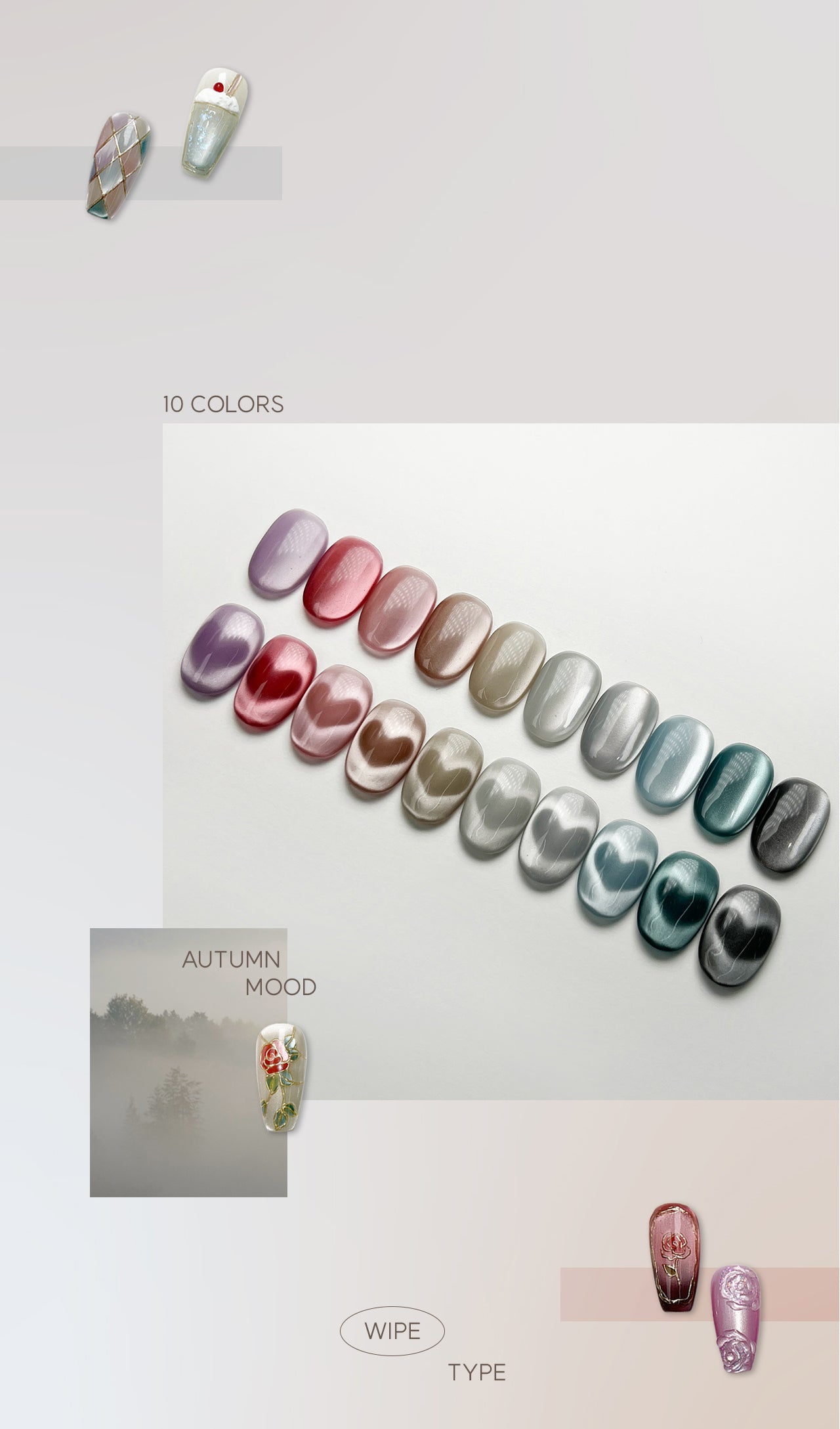 Introducing the Hazy Collection by Mithmillo — a curated series of 10 wipe-type magnetic gels inspired by misty mornings, fading sunsets, and still forest air. Each shade combines pastel softness with deep pearlescent shimmer, allowing precise magnetic effects and seamless gradients.